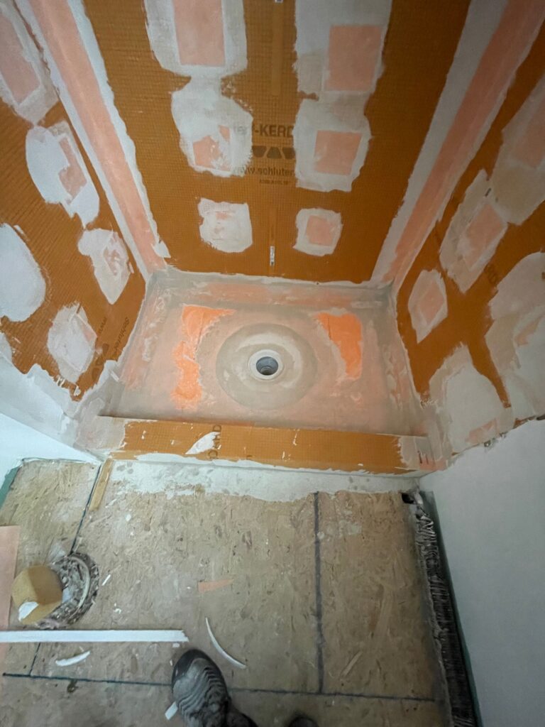 In the photos from this week’s progress, you’ll see the Kerdi membrane installed across the shower walls, floor, and curb, creating that continuous waterproof layer.