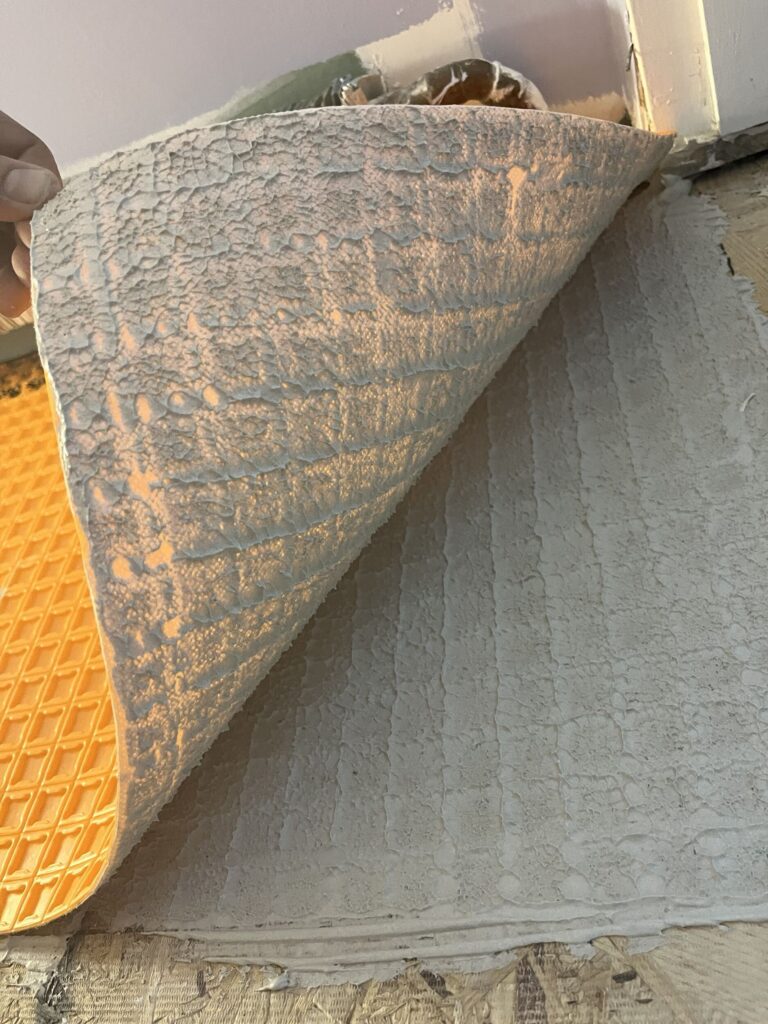 For this project, Ditra was installed using Schluter’s recommended thin-set mortar, ensuring full adhesion to the subfloor. One of the photos from this week shows the complete thin-set coverage beneath the Ditra membrane, which is critical for proper performance.