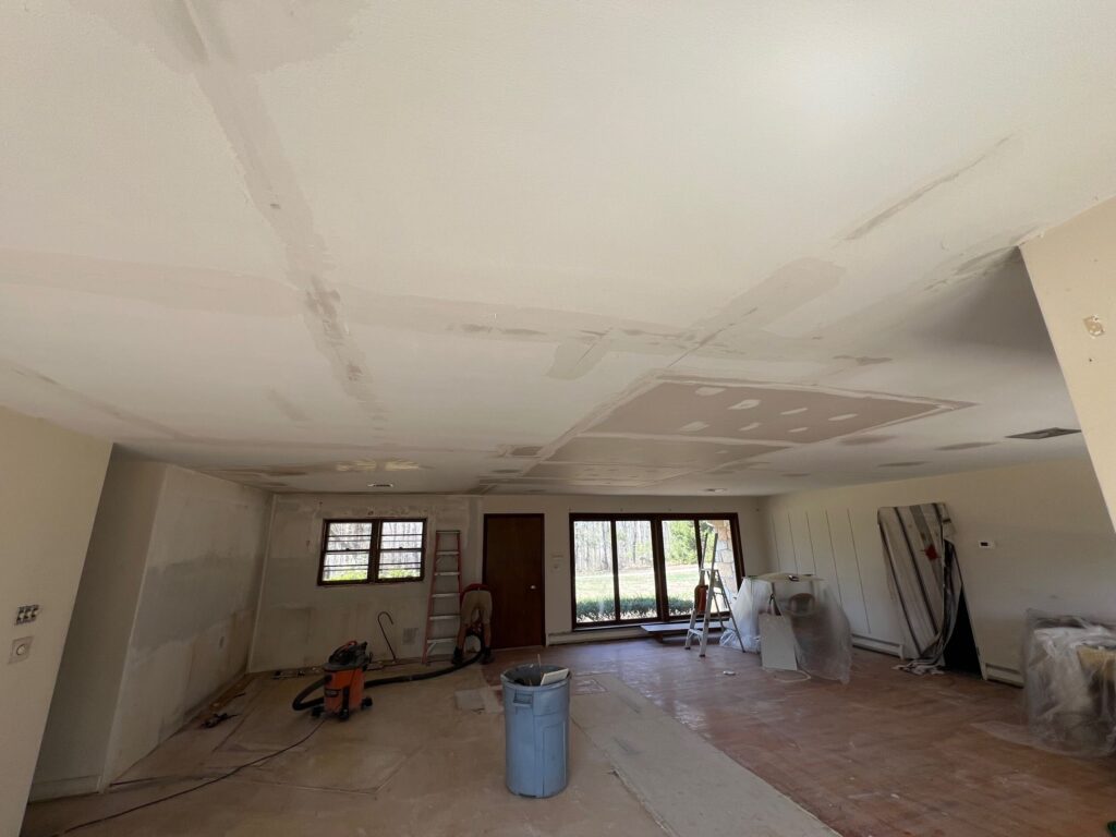 After removing an old chimney from one of our renovation projects, the next step was restoring the interior drywall where the structure had previously passed through the home.